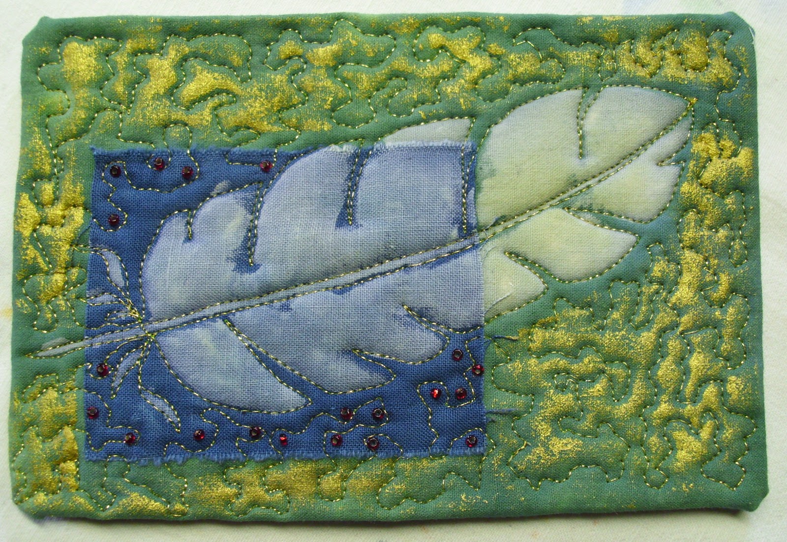 ... haben den Stoffen zu ihrem schönen Braunton verholfen. Ich habe sie mit blauem Balibatik kombiniert und mit Goldfaden gequiltet, die Karten mit Markal bemalt und das Notizbuch entfärbt.